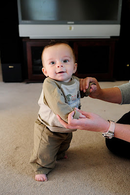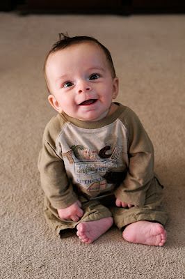 Hi Mister-mister! I can't believe you are already five months old, time is truly flying!I also can't believe that my tiny little boy is now rolling and sitting and laughing out-loud!  You are growing up so fast, and while there is a part of me that expected it because I just watched your sister grow and change from a tiny newborn, I guess I thought you would take a bit longer because you started so small.  The world, lately, is less offensive to you...you tolerate so much more, need a little bit less sleep, and you don't need as much maintenence and upkeep as you once did.  You're settling into routines and soon you'll have your very own bed and crib and space away from your snoring Daddy--as a I fear he may be the reason you only sleep for one five hour stretch a day and then you stir easliy after midnight until we are up for the day.  You tolerate being worn in a wrap and in a pouch and in a ring sling...praise be to GOD!  You love the bath and your sister loves to get in with you...embarrisingly enough she often says, "May I touch his penis?" followed by, "May I touch his knee, ear, cheek, elbow, eyes...etc." and she'll often say, "Naken BOoooy," and grab your litle cheeks and put her face close to yours.  I'm sure you won't find this amusing when you're older, but for now, it can be cute!   You nurse now at 7am, 9am, 11am, 1pm, 3pm, 5:30pm and 7:30pm....no wonder you're growing like crazy.  Overnight you usually nurse once or twice but just long enough to fall back asleep with a smile on your face.  You still need to be swaddled to get a good sleep and sometimes you are still sleeping in your swing, although the Amby bed is splitting the time pretty equally now.  You still need to be bounced every day for your naps and I sometimes wonder if I am going to be bouncing a five year old on the exercise ball wrapped in an enormous swaddle blanket--probably not, but maybe. You giggle and squeal when I tickle and bite your ribs--just like you sister!  You smile when I come into view and cry when you can't see me. You grab at toys and like to pull everything into your mouth.  Thank god the second round of gentian violet got rid of the thrush, it was not fun!  You like to look at bright things and do much better at dinner time when we eat outside and you can watch the birds fly over head.  You still aren't much for snuggling and fight sleep like you wouldn't believe.  You're as cute as can be and I can't believe I get to be your mom!  I can't wait to see what the future has for us...what you will be like, what you will think about and say someday.  You're getting a tiny bit better with the bottle although I know you would rather I just stay home and be available to you constantly...soon enough you'll have some solid food to try and then before we know it you'll be a big strong boy like your sister wolfing down whole ears of corn all by yourself!  Weddings calm down in October, so soon I shouldn't have to leave you as often...just know that whenever I'm gone I miss you like crazy, little guy!  Keep growing and changing and getting stronger, it is so amazing to watch my babies grow into people! I love you more than words, Mommy